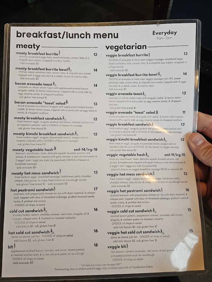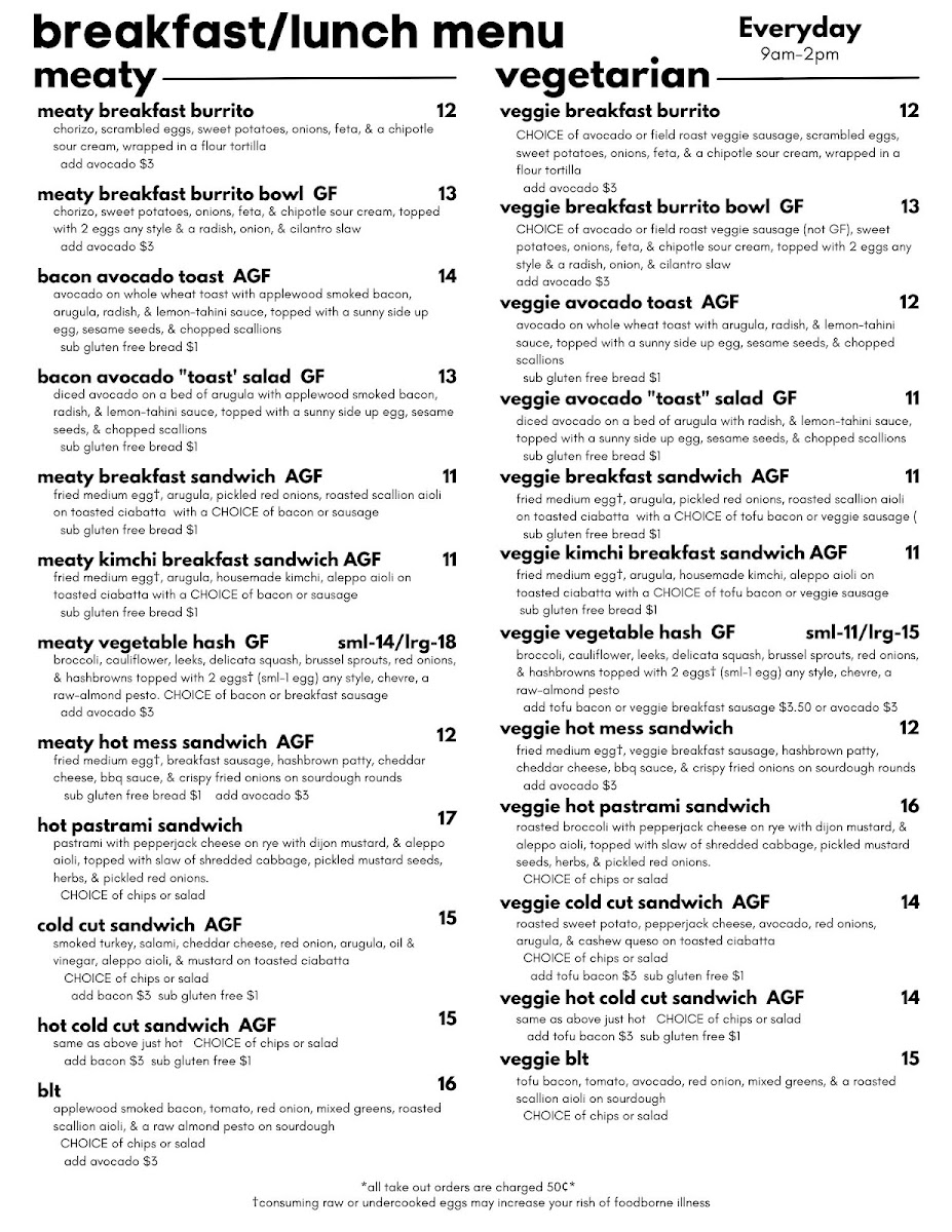 House fermented kimchi with a fried egg, arugula, aleppo aioli, on ciabatta with a choice of bacon or sausage. **ATTN: The options provided are the only options available. We cannot accommodate written substitutions or alterations**
