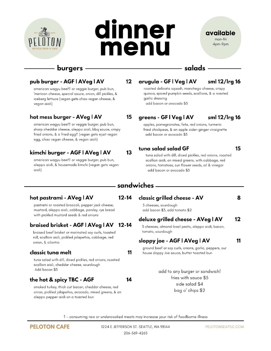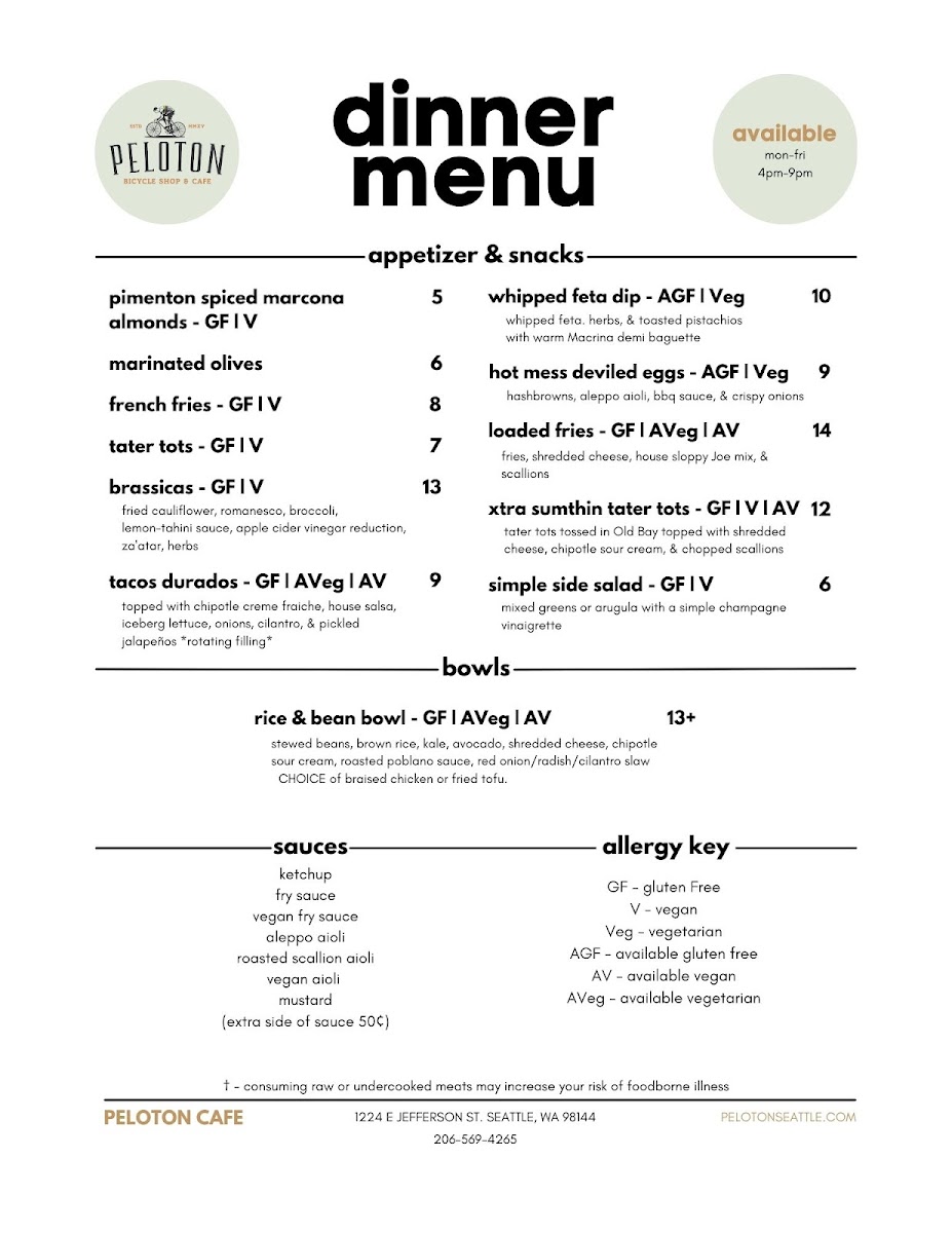 Welcome to the Peloton Cafe Bike Shop, a delightful fusion of health and taste located at 1224 E Jefferson St, Seattle. This vibrant cafe offers an array of menu options that cater to diverse dietary preferences, making it a go-to spot for everyone.